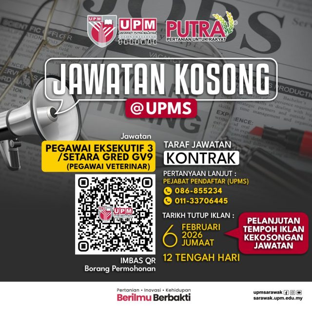 Universiti Putra Malaysia melalui Kampus Sarawak (UPMS) membuka peluang kerjaya kepada Warganegara Malaysia yang berkelayakan untuk mengisi kekosongan jawatan Pegawai Eksekutif 3 / Setara Gred GV9 (Pegawai Veterinar). Iklan jawatan ini adalah pelanjutan tempoh permohonan, memberi peluang tambahan kepada calon yang berminat dan memenuhi syarat.