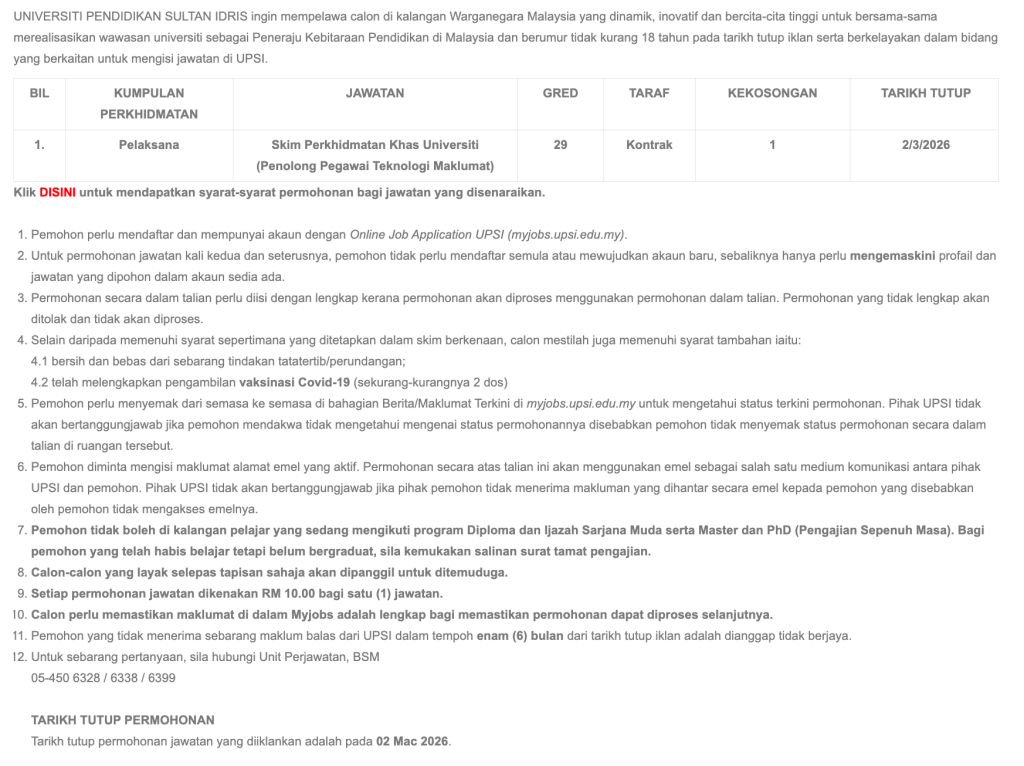 Jawatan Kosong UPSI 2026 – Penolong Pegawai Teknologi Maklumat (SPKU29) | Permohonan Dibuka