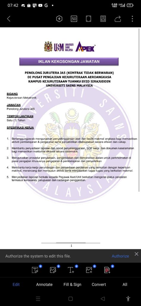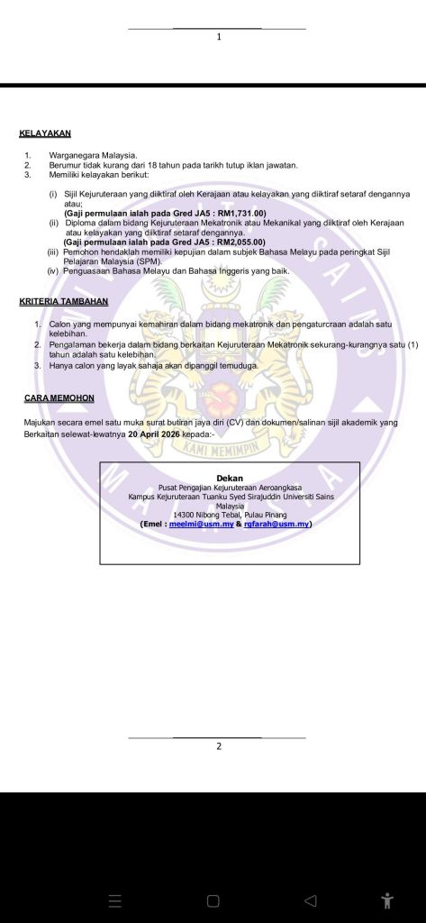 Berita baik! Universiti Sains Malaysia (USM) kini membuka peluang kerjaya bagi jawatan Penolong Jurutera Gred JA5 (Kontrak Tidak Berwaran) di Pusat Pengajian Kejuruteraan Aeroangkasa.