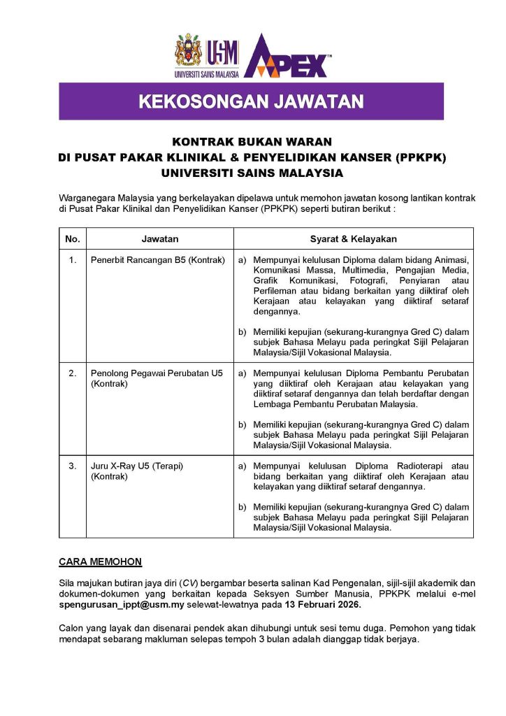 Universiti Sains Malaysia (USM) berstatus APEX University kini membuka peluang kerjaya di Pusat Pakar Klinikal & Penyelidikan Kanser (PKPK) bagi lantikan kontrak (bukan waran) kepada warganegara Malaysia yang berkelayakan.