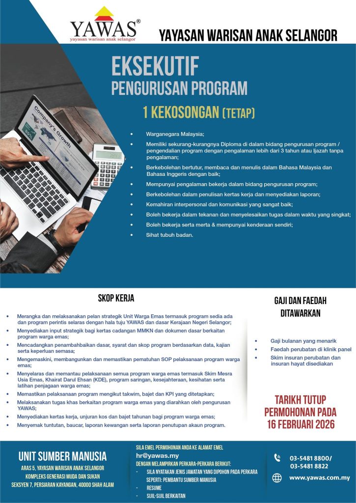 Peluang kerjaya tetap kini dibuka di Yayasan Warisan Anak Selangor (YAWAS) melibatkan pengurusan program komuniti, pentadbiran serta grafik & pemasaran digital.