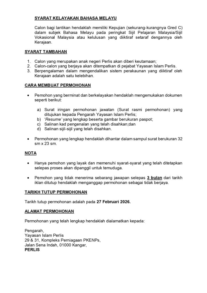 Yayasan Islam Perlis membuka peluang kerjaya kepada Warganegara Malaysia yang berkelayakan untuk mengisi kekosongan jawatan Penolong Akauntan Gred W5. Jawatan ini sesuai khususnya untuk lepasan Sijil, Diploma dan bidang Perakaunan/Kewangan yang ingin membina kerjaya dalam institusi berteraskan perkhidmatan Islam di peringkat negeri.