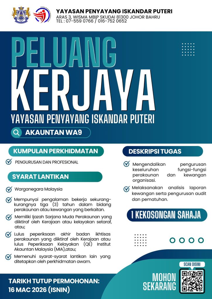Peluang kerjaya dalam sektor organisasi komuniti kini dibuka apabila Yayasan Penyayang Iskandar Puteri mempelawa calon yang berkelayakan untuk mengisi jawatan Akauntan WA9.