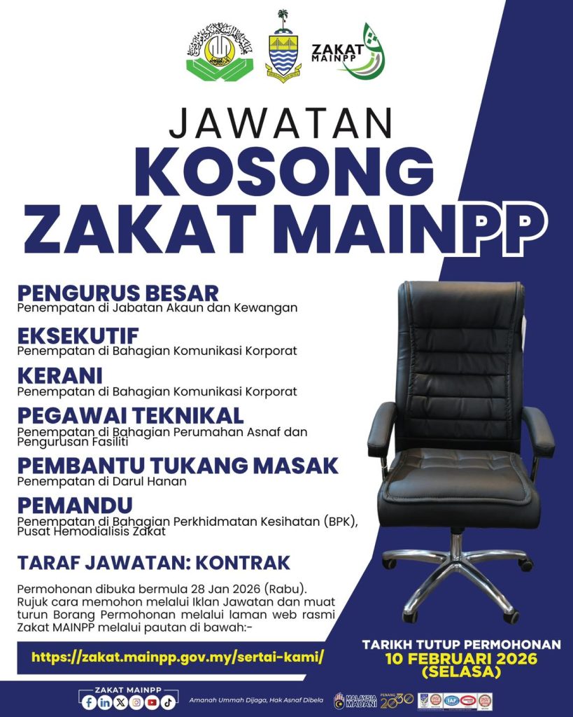 Jika anda memenuhi syarat yang ditetapkan, segera layari laman rasmi Zakat MAINPP dan buat permohonan sebelum 10 Februari 2026.