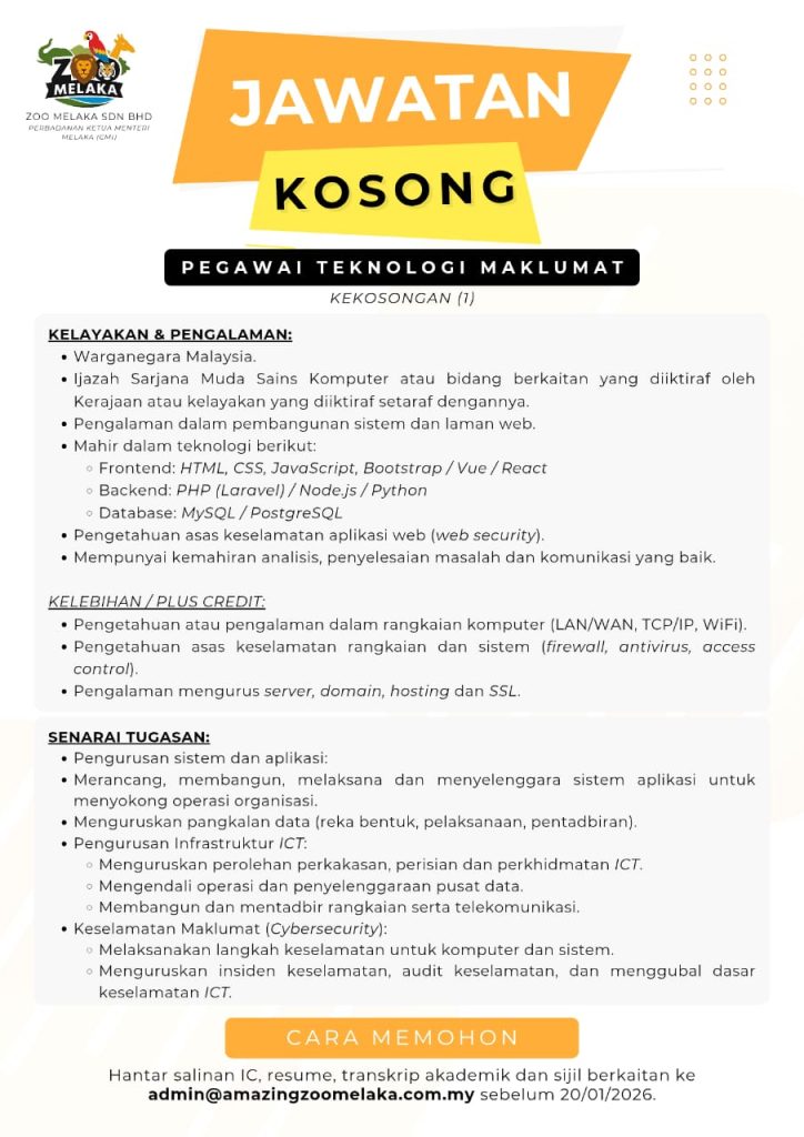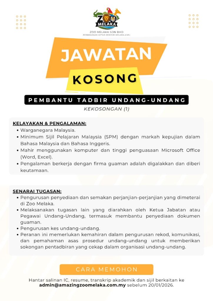 Zoo Melaka Sdn. Bhd. kini membuka beberapa peluang kerjaya bagi tahun 2026 melibatkan jawatan pentadbiran, kewangan dan teknologi maklumat. Tawaran ini amat sesuai untuk pelbagai latar belakang calon, sama ada lepasan SPM yang baru memulakan kerjaya atau graduan profesional yang mempunyai kemahiran teknikal khusus.
