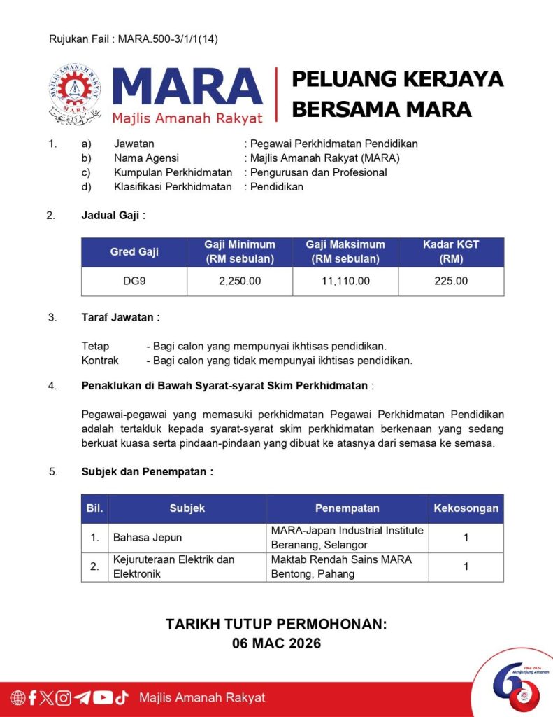 Jawatan ini menawarkan peluang lantikan tetap atau kontrak, dengan skim gaji menarik serta penempatan di institusi pendidikan MARA terpilih di seluruh Malaysia.