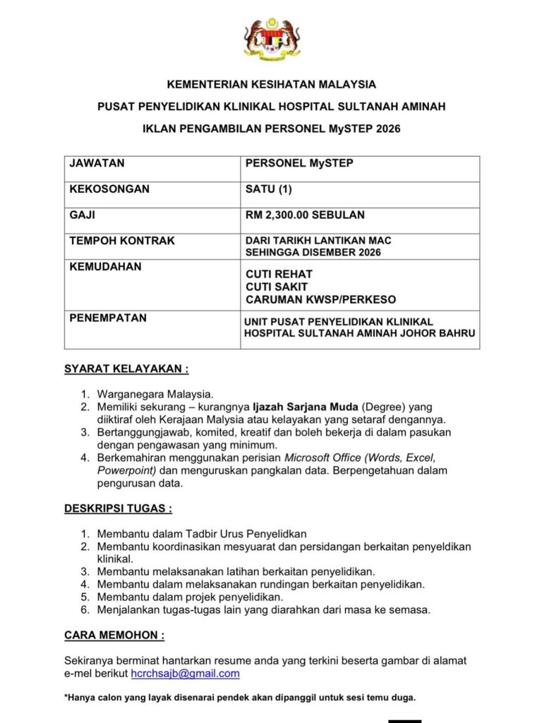 Dengan hormatnya saya merujuk kepada iklan pengambilan Personel MySTEP 2026 di Pusat Penyelidikan Klinikal, Hospital Sultanah Aminah Johor Bahru.