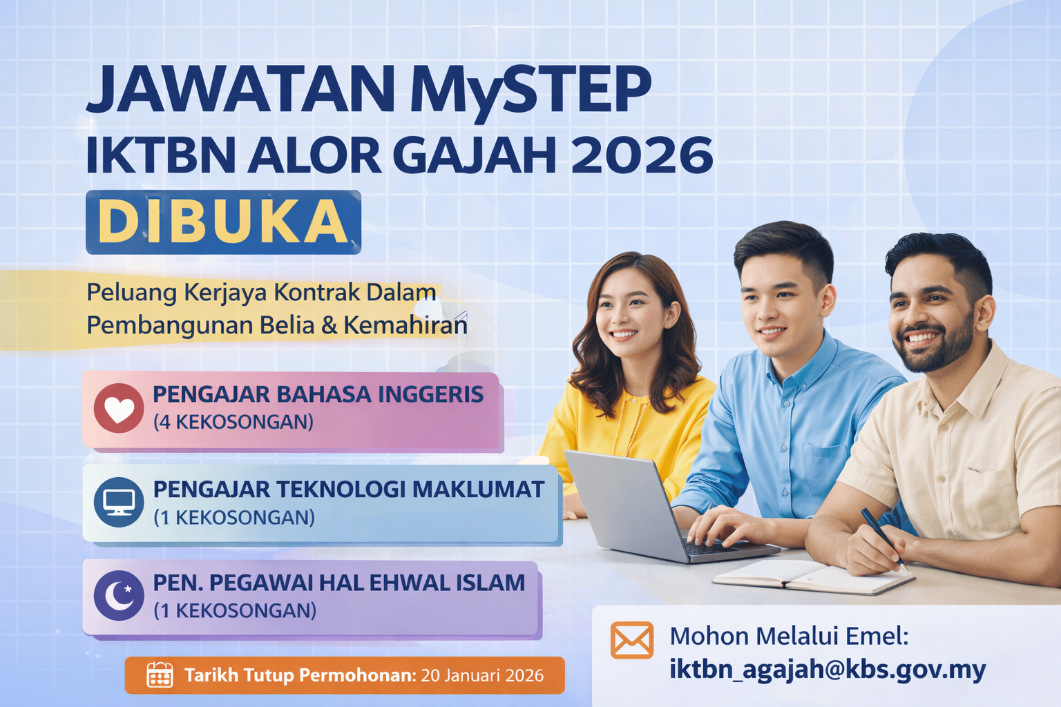 Ringkas & Penting: Pengambilan MySTEP oleh IKTBN Alor Gajah (KBS) untuk jawatan pengajaran & sokongan akademik. Permohonan dihantar melalui emel dengan resume bergambar. Tarikh tutup: 20 Januari 2026 (Selasa).