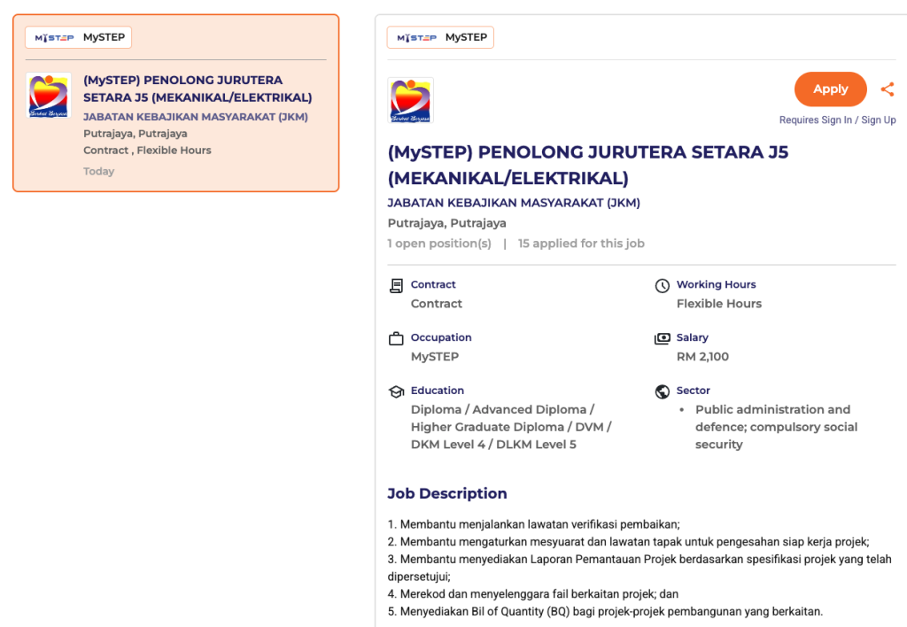- Cari jawatan Penolong Jurutera Setara J5 (Mekanikal / Elektrikal) atau gunakan penapis lokasi Putrajaya dan skim MySTEP.