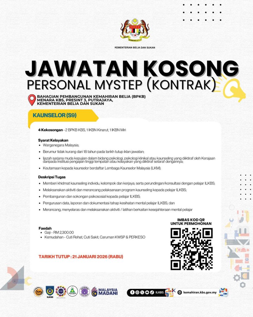 Sedang mencari peluang kerja sektor awam yang boleh membina pengalaman sebenar serta memperkukuh resume? Kementerian Belia dan Sukan (KBS) kini membuka pengambilan Personel MySTEP (Kontrak) bagi beberapa jawatan strategik di bawah Bahagian Pembangunan Kemahiran Belia (BPKB).