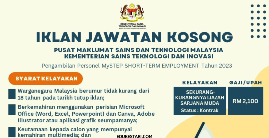 Anda graduan yang sedang mencari kerja dan peluang untuk bina kerjaya? Jom bina kerjaya dengan peluang penempatan MySTEP yang dibuka oleh Kementerian Sains, Teknologi Dan Inovasi (MOSTI) tahun 2023 ini! Calon yang layak mendapat penempatan akan berkhidmat secara kontrak pada tahun 2023.