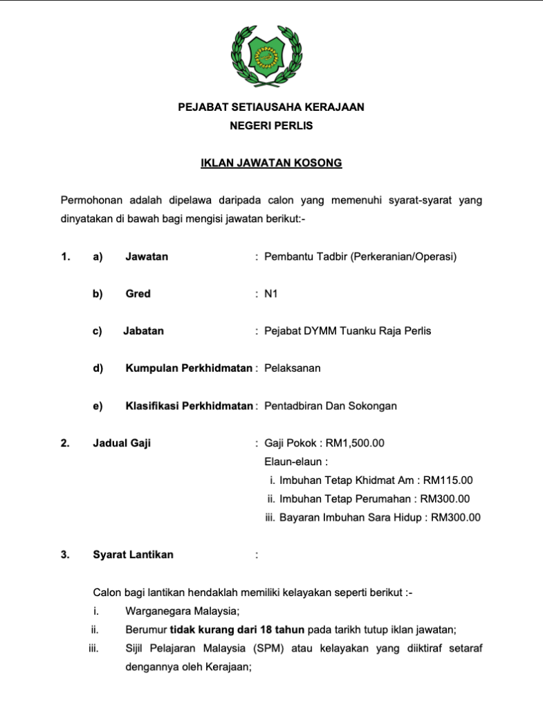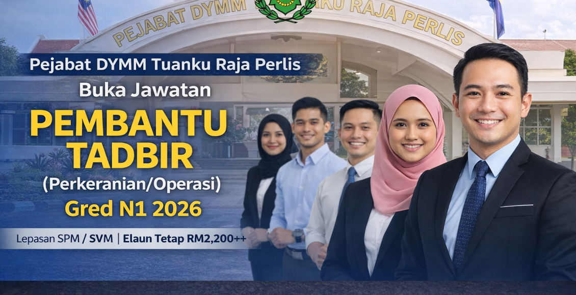Pejabat DYMM Tuanku Raja Perlis mempelawa warganegara Malaysia yang berkelayakan untuk mengisi kekosongan jawatan Pembantu Tadbir (Perkeranian/Operasi) Gred N1 secara lantikan kontrak. Jawatan ini sesuai untuk calon lepasan SPM atau SVM yang berminat membina kerjaya dalam bidang pentadbiran dan sokongan sektor kerajaan negeri.