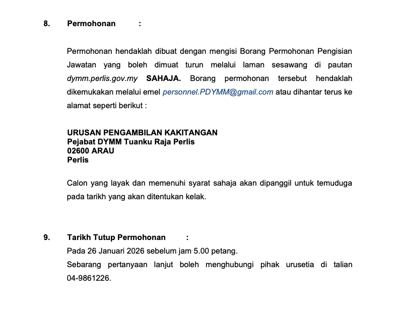 - Serahan tangan / pos: Urusan Pengambilan Kakitangan, Pejabat DYMM Tuanku Raja Perlis, 02600 Arau, Perlis