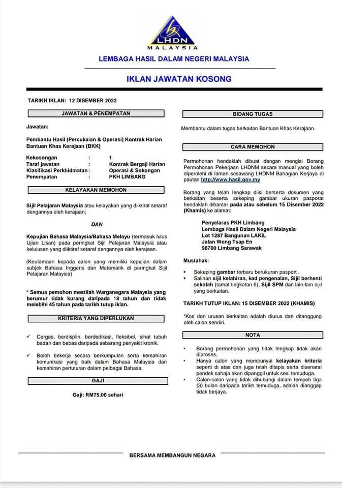 Permohonan bagi individu yang berkelayakan boleh dibuat secara atas talian melalui sistem khas yang disediakan iaitu Portal Pencarian Kerja LHDNM selewat-lewatnya 15 Disember 2022. Jika berminat, pastikan anda hantar permohonan segera!