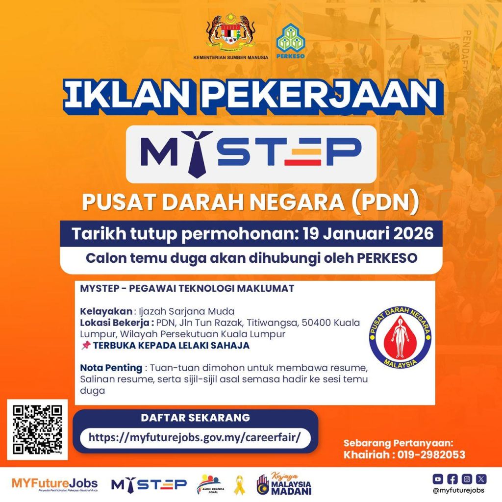 Berita baik untuk graduan dan profesional dalam bidang Teknologi Maklumat. Pusat Darah Negara (PDN) kini membuka peluang kerjaya di bawah program MySTEP 2026 bagi jawatan Pegawai Teknologi Maklumat, khusus untuk calon yang ingin membina pengalaman kerja dalam sektor awam.