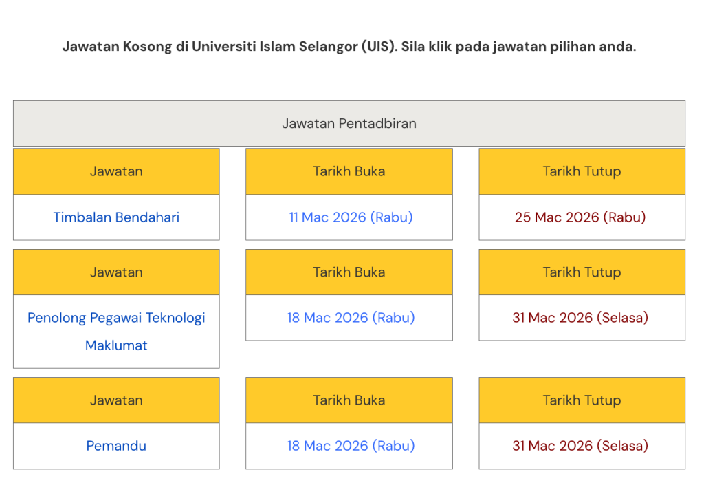 Universiti Islam Selangor (UIS) kini membuka peluang kerjaya kepada rakyat Malaysia yang berkelayakan untuk mengisi beberapa jawatan pentadbiran dan teknikal bagi tahun 2026. Peluang ini sesuai untuk calon yang ingin membina kerjaya dalam sektor pendidikan tinggi dengan persekitaran kerja profesional dan stabil.
