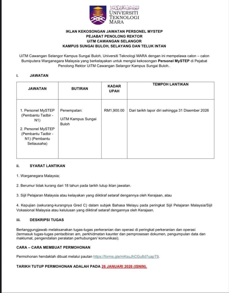 Jawatan Personel MySTEP UiTM Cawangan Selangor Dibuka – Gaji RM1,900 Sehingga Disember 2026