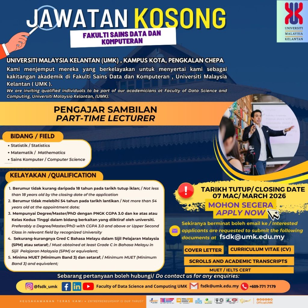 Universiti Malaysia Kelantan (UMK) mempelawa individu yang berkelayakan dan berpengalaman untuk menyertai institusi ini sebagai Pengajar Sambilan (Part-Time Lecturer) di Fakulti Sains Data dan Komputeran bagi sesi pengajaran akan datang.