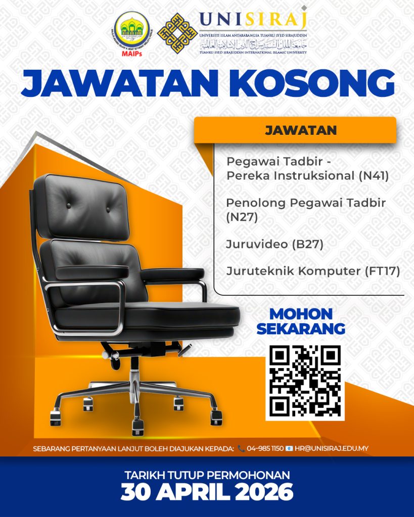 Universiti Islam Antarabangsa Tuanku Syed Sirajuddin (UniSIRAJ) kini membuka peluang kerjaya kepada individu berkelayakan untuk mengisi beberapa jawatan penting dalam organisasi mereka. Hebahan ini melibatkan pelbagai bidang termasuk pentadbiran, teknikal dan media.