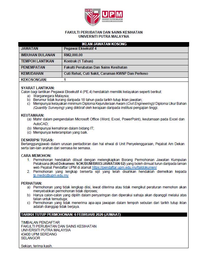 Universiti Putra Malaysia (UPM) melalui Fakulti Perubatan dan Sains Kesihatan membuka 1 kekosongan jawatan bagi posisi Pegawai Eksekutif 4 (PE4) secara kontrak selama setahun.