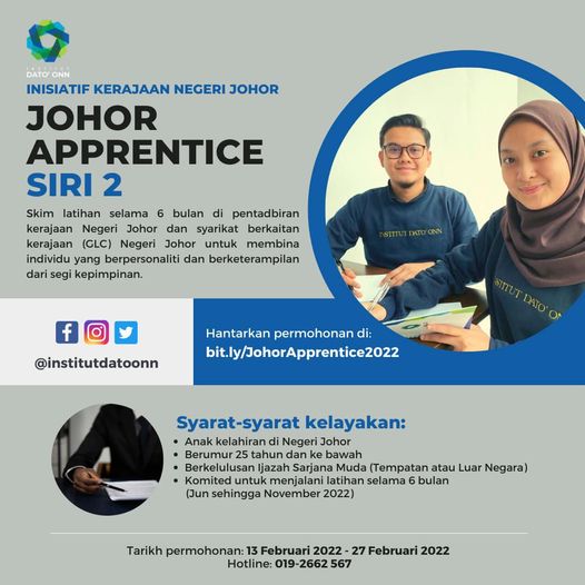 Untuk maklumat lanjut atau sebarang pertanyaan berkenaan program Johor Apprentice, anda boleh hubungi Dalyana di talian 019 2662 576 atau terus ke laman facebook rasmi facebook.com/institutdatoonn.