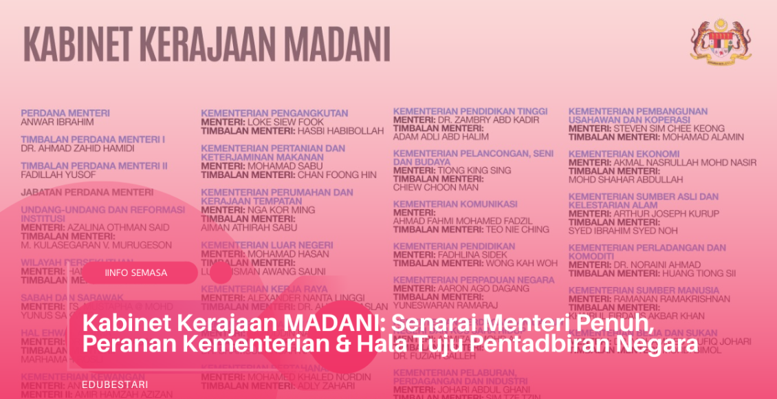 Artikel ini menghimpunkan senarai Kabinet Kerajaan MADANI, peranan utama setiap kementerian, serta kepentingan struktur kabinet dalam menjayakan agenda pembangunan negara secara inklusif dan mampan.