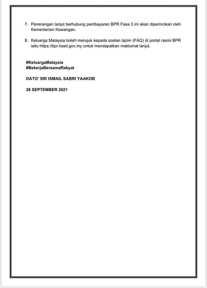 Pembayaran Bantuan Prihatin Rakyat (BPR) Keluarga Malaysia Fasa 3 dan rayuan BPR akan dikreditkan ke dalam akaun penerima mulai 28 September 2021 secara berperingkat. Pembayaran ini akan memanfaatkan seramai 3.6 juta penerima sedia ada kategori isi rumah dan pemohon rayuan BPR yang telah diluluskan.