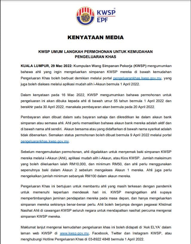 Maklumat lanjut mengenai kemudahan pengeluaran khas ini boleh didapati di “Ask ELYA” dalam laman web KWSP di www.kwsp.gov.my, Facebook, Twitter dan Instagram KWSP atau hubungi Hotline Pengeluaran Khas di 03 8922 4848 mulai 1 April 2022.