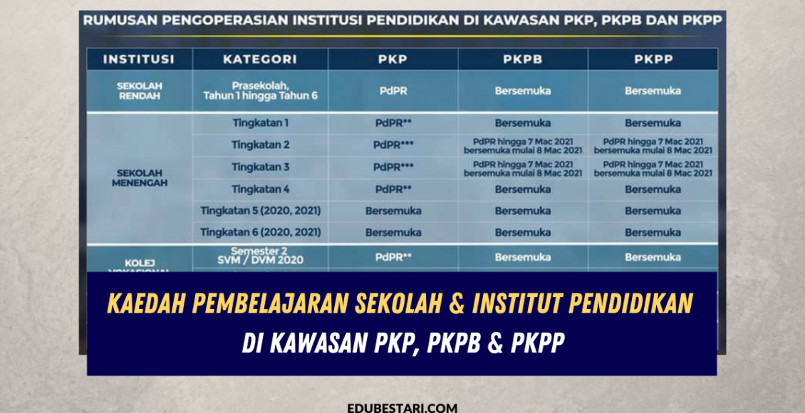 Masih belum jelas dengan makluman terkini kemasukan sekolah di kawasan PKP, PKPB & PKPP? Terkini Menteri Kanan Pendidikan memberikan penjelasan yang lebih ringkas dan mudah difahami berkenaan kaedah pembelajaran sekolah rendah & menengah di kawasan PKP, PKPB dan PKPP.