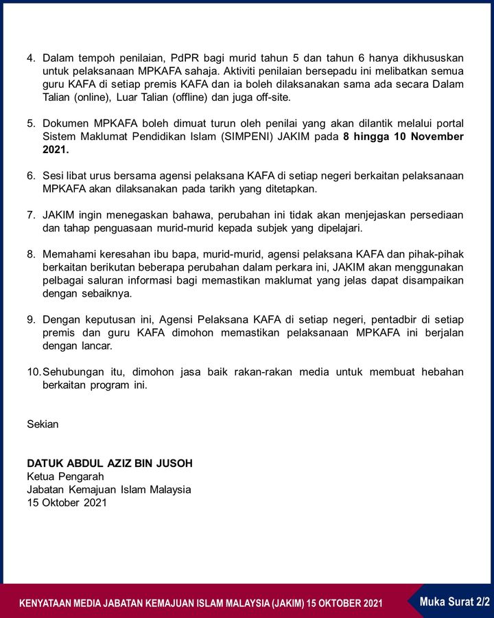 Sukacita diumumkan bahawa Penilaian Kelas Al-Quran dan Fardhu Ain tahun 2021 atau MPKAFA bagi menggantikan subjek bertulis akan dilaksanakan serentak di seluruh negara pada: