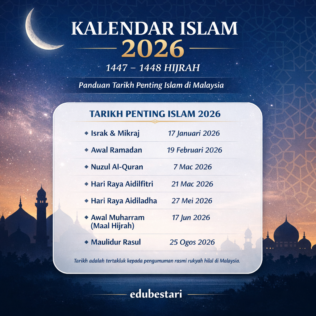 Takwim Islam 2026 (1447–1448H) merupakan panduan penting bagi umat Islam di Malaysia dalam merancang ibadah, cuti agama, dan aktiviti keluarga sepanjang tahun. Tarikh-tarikh seperti Awal Ramadan, Aidilfitri, Aidiladha dan Maal Hijrah bukan sekadar tarikh dalam kalender, tetapi momen spiritual untuk memperteguh keimanan dan amal soleh.
