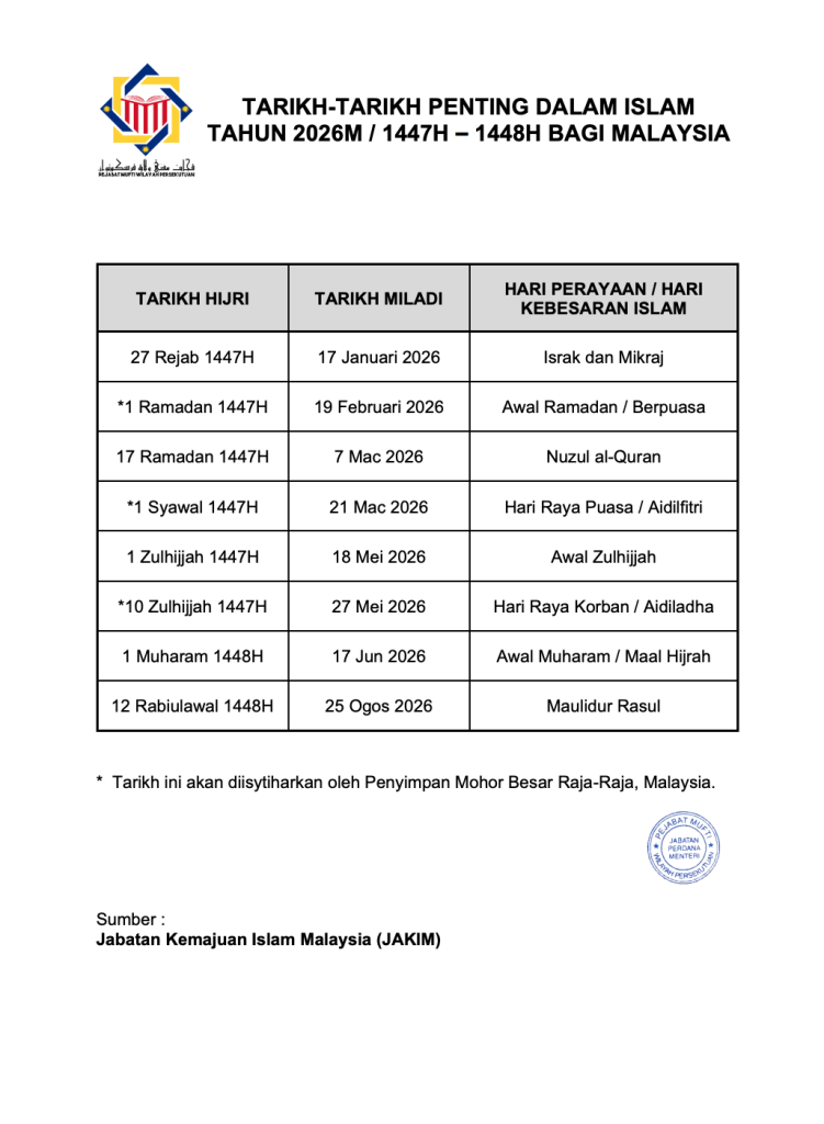 - Untuk perancangan ibadah seperti puasa, solat sunat atau perjalanan haji, sentiasa rujuk pengumuman rasmi pejabat agama negeri atau JAKIM.