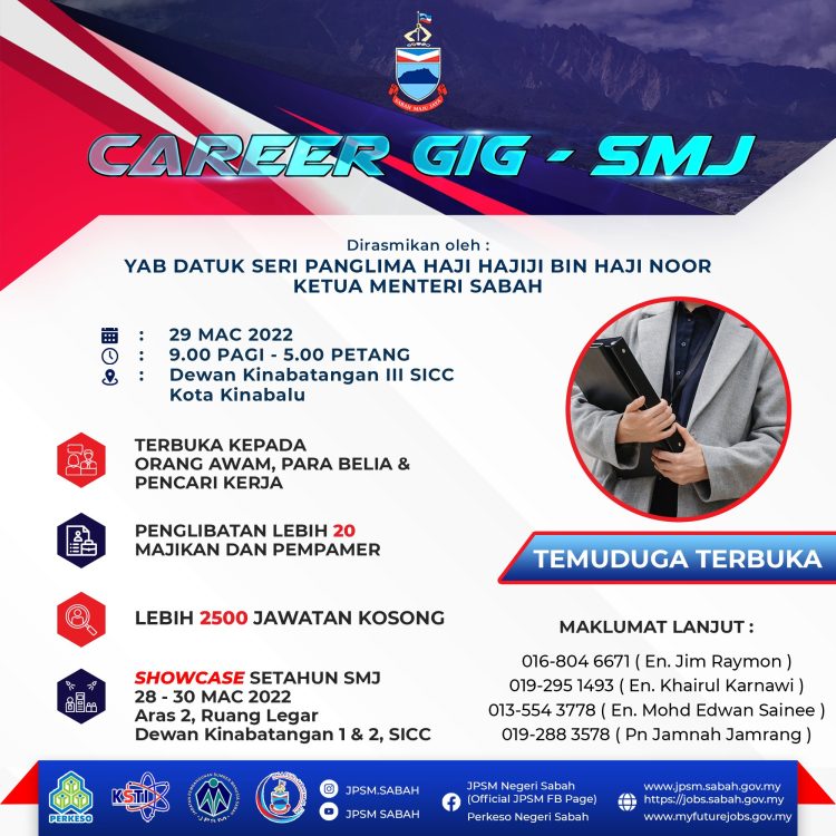 Pencari kerja yang berminat nak ikuti Karnival Pekerjaan Sempena Hari terbuka Sabah Maju Jaya ini boleh buat pendaftaran sebelum tarikh temuduga. Pelbagai peluang pekerjaan ditawarkan oleh pelbagai majikan syarikat terkemuka.