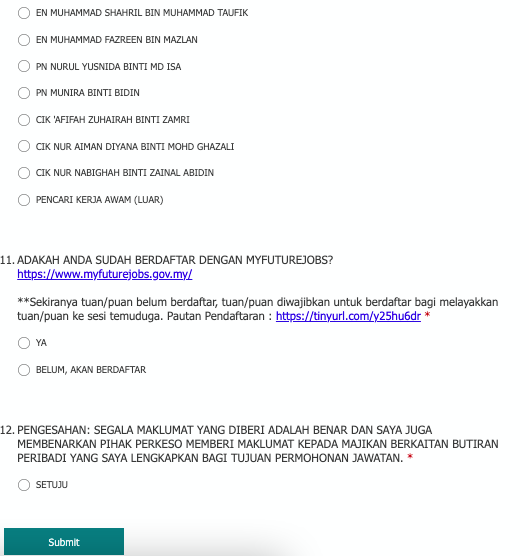 Klik submit untuk hantar borang pendaftaran. Untuk maklumat lanjut atau sebarang pertanyaan mengenai Karnival Kerjaya Digital Melaka Careertrans, anda boleh terus ke laman Facebook PERKESO Melaka atau hubungi pegawai bertugas di talian 03 251 6888.