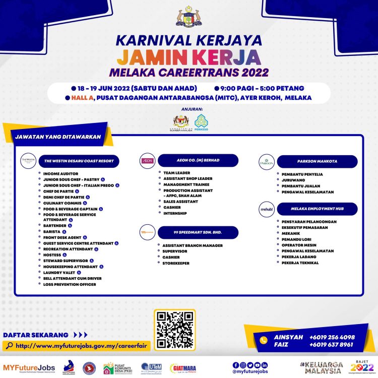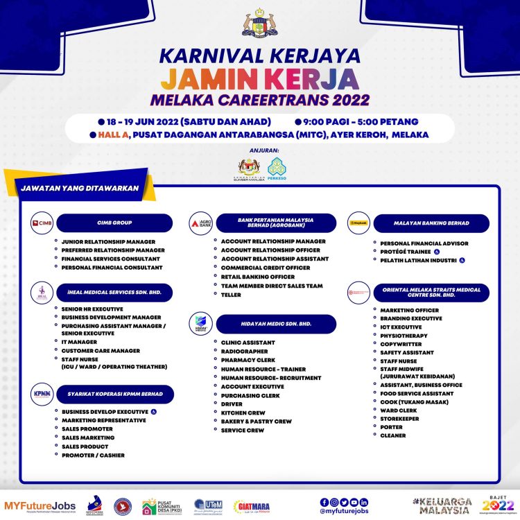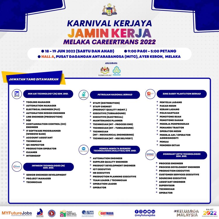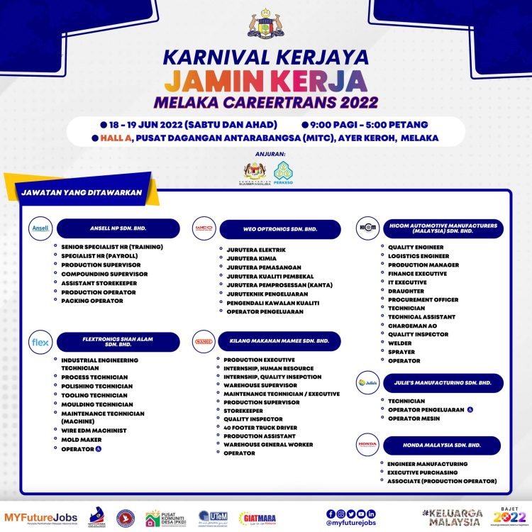 Pencari kerja yang berminat nak ikuti karnival kerjaya secara fizikal ini boleh buat pra-pendaftaran terlebih dahulu sebelum tarikh tarikh program. Temuduga akan diadakan pada 18 – 19 Jun 2022.