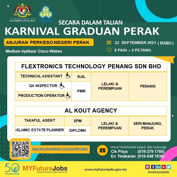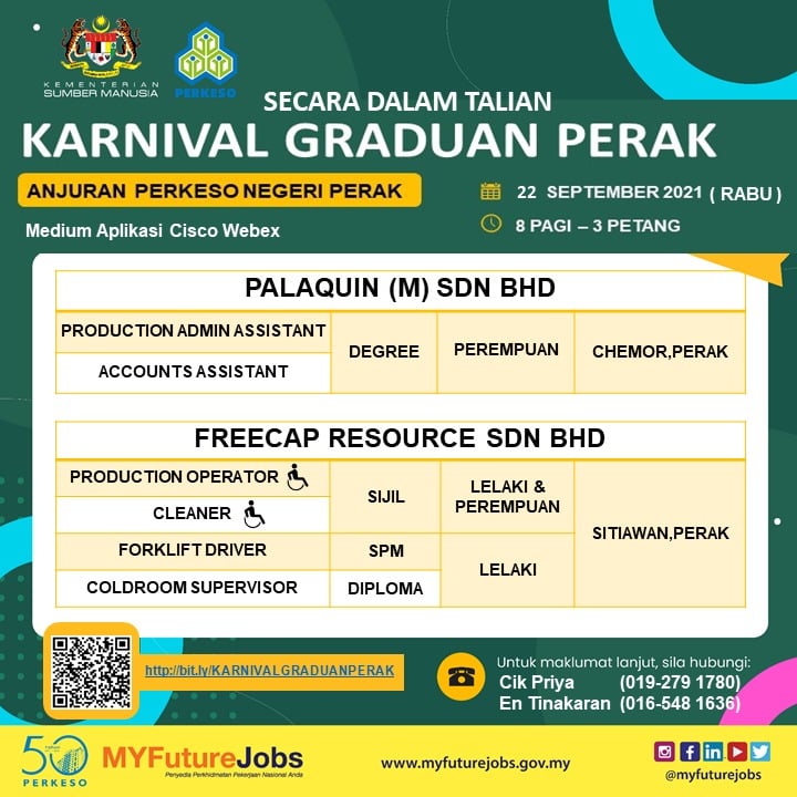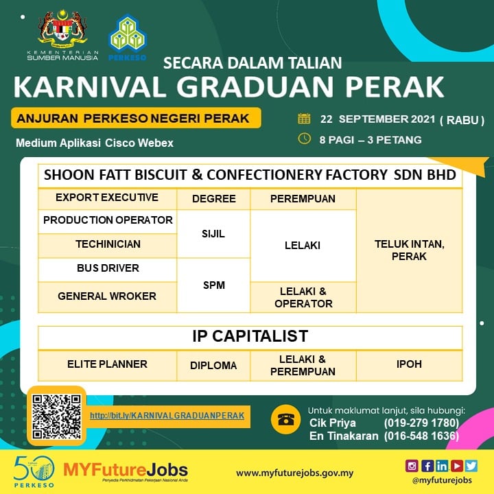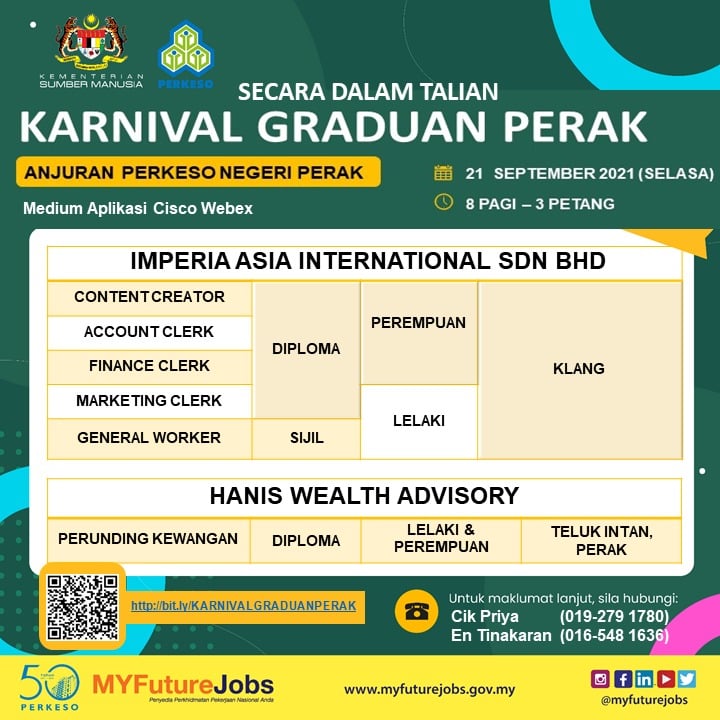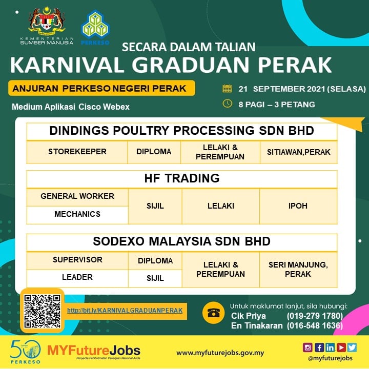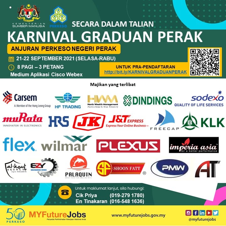 Paggilan buat graduan yang masih menganggur di negeri Perak! Pihak PERKESO Negeri Perak akan mengadakan Karnival Graduan Negeri Perak secara atas talian bagi membantu graduan mendapatkan peluang pekerjaan dan mengisi pelbagai kekosongan jawatan yang ditawarkan oleh pelbagai majikan.