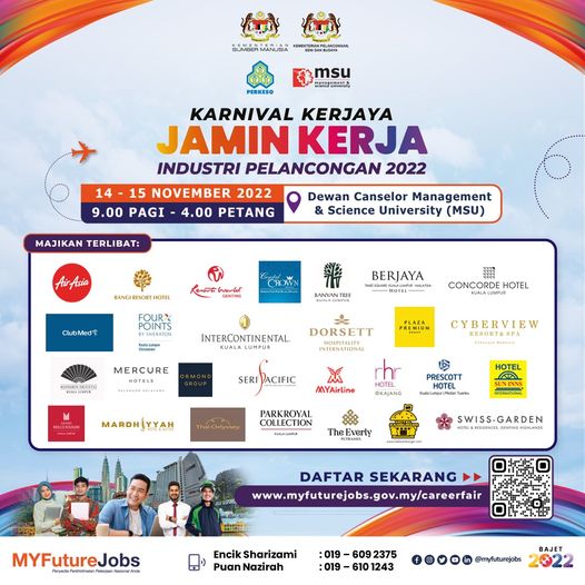 Ratusan peluang pekerjaan menanti anda di Karnival Kerjaya JaminKerja yang akan berlangsung selama 2 hari bermula 14 November 2022 di Dewan Canselor MSU. Pelbagai aktiviti menanti anda seperti kaunseling kerjaya, bantuan pendaftaran Portal Pekerjaan Nasional, sesi temuduga dan banyak lagi.