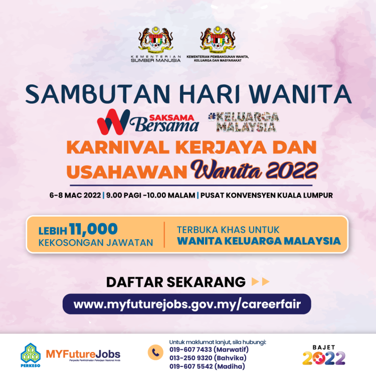 Sukacita dimaklumkan bahawa Kementerian Pembangunan Wanita, Keluarga dan Masyarakat akan menganjurkan Karnival Kerjaya dan Usahawan Wanita bagi memberi peluang pekerjaan kepada semua pencari kerja di luar sana sama ada yang baru mencari pekerjaan atau yang terjejas akibat pandemik Covid-19.