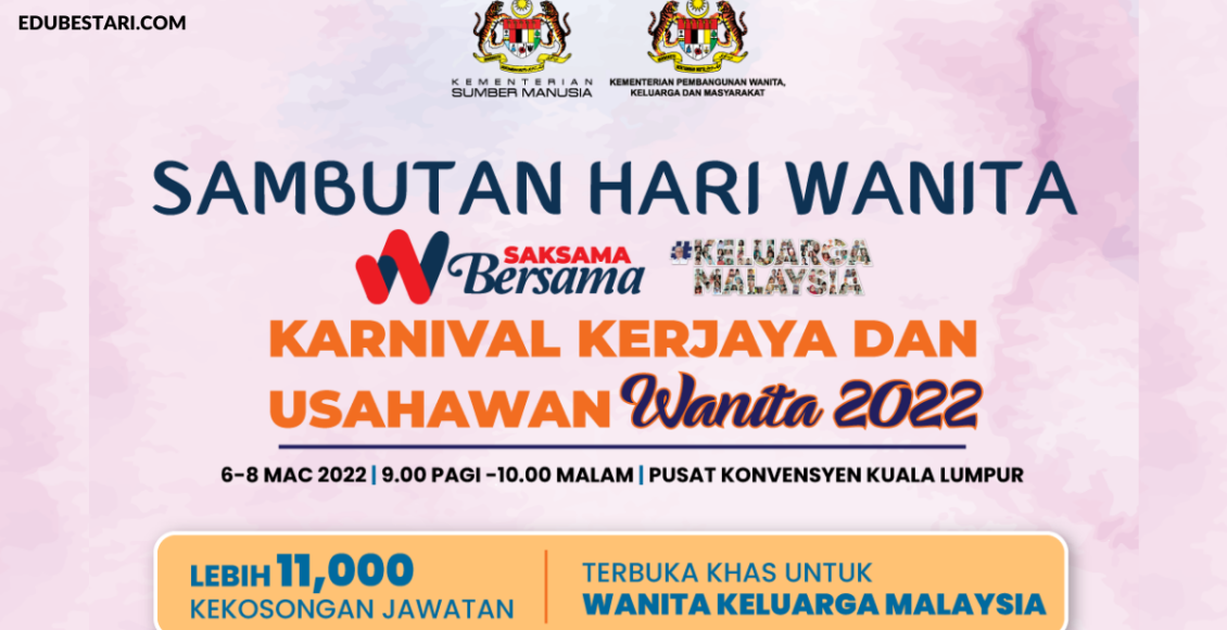 Sukacita dimaklumkan bahawa Kementerian Pembangunan Wanita, Keluarga dan Masyarakat akan menganjurkan Karnival Kerjaya dan Usahawan Wanita bagi memberi peluang pekerjaan kepada semua pencari kerja di luar sana sama ada yang baru mencari pekerjaan atau yang terjejas akibat pandemik Covid-19.