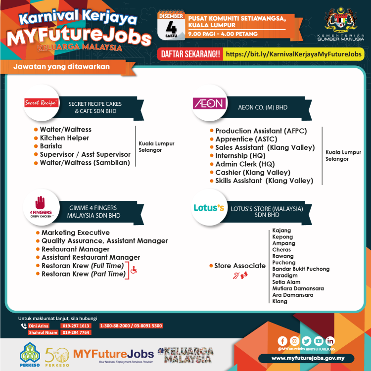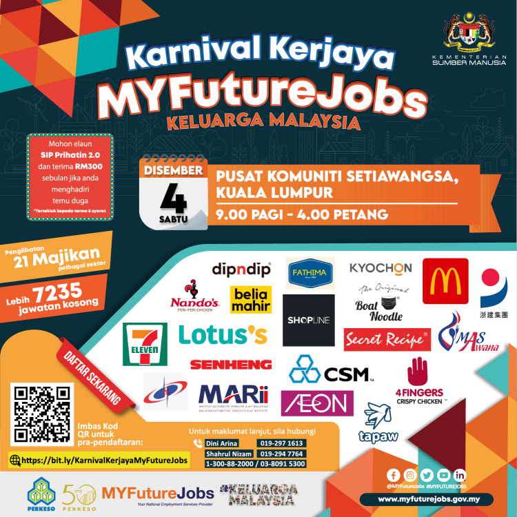 Anda sedang mencari kerja? PERKESO Wilayah Persekutuan Kuala Lumpur mempelawa orang ramai untuk sertai Karnival Kerjaya MyFutureJobs Keluarga Malaysia yang akan dilaksanakan secara fizikal pada tarikh dan masa yang ditetapkan. Terdapat lebih 7235 jawatan kosong untuk diisi dengan penglibatan 21 majikan dari pelbagai sektor.