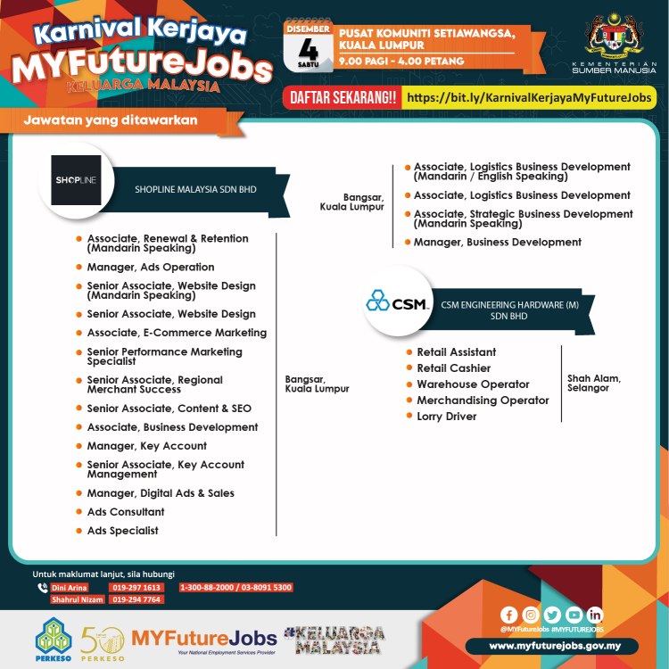 Untuk maklumat lanjut atau sebarang pertanyaan berkenaan Karnival MyFutureJobs Keluarga Malaysia, anda boleh hubungi: