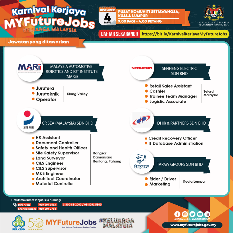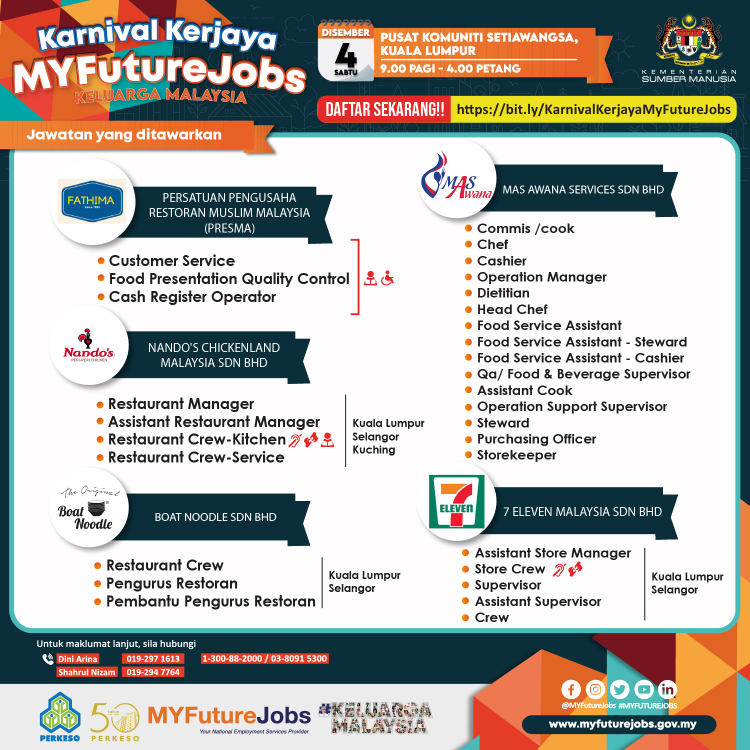 Anda sedang mencari kerja? PERKESO Wilayah Persekutuan Kuala Lumpur mempelawa orang ramai untuk sertai Karnival Kerjaya MyFutureJobs Keluarga Malaysia yang akan dilaksanakan secara fizikal pada tarikh dan masa yang ditetapkan. Terdapat lebih 7235 jawatan kosong untuk diisi dengan penglibatan 21 majikan dari pelbagai sektor.