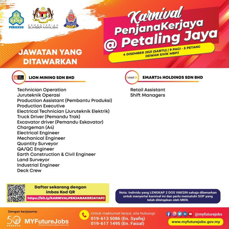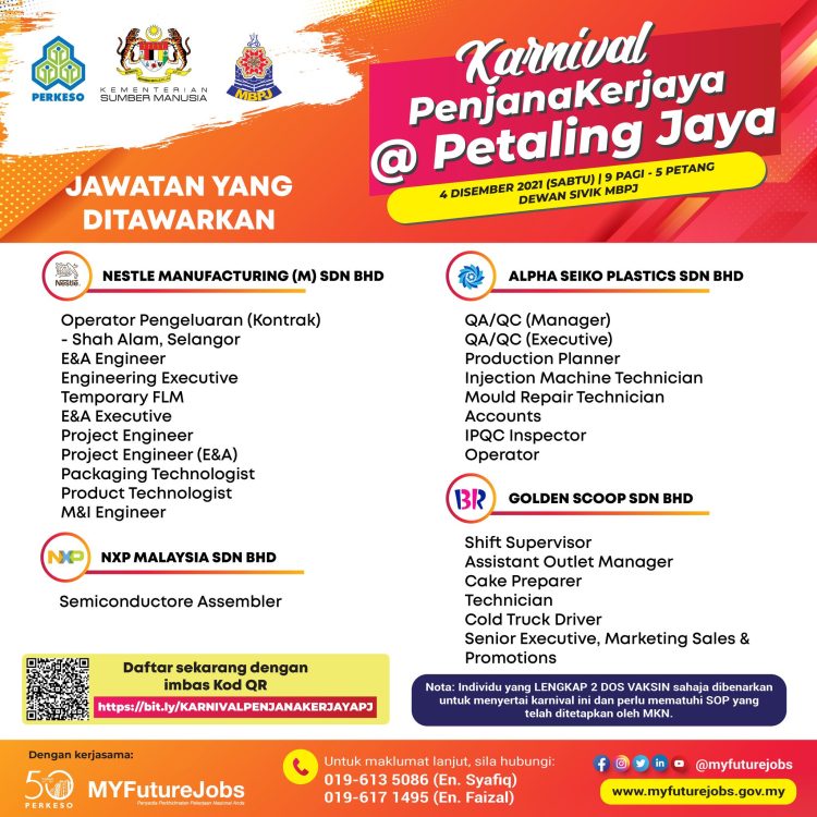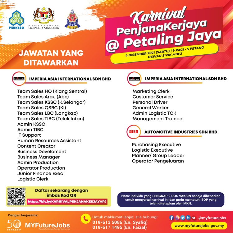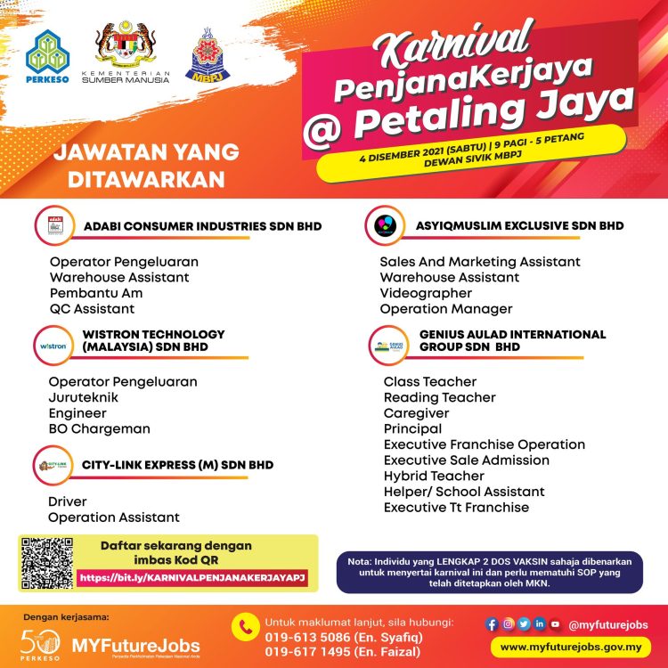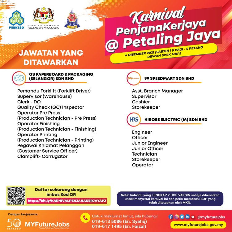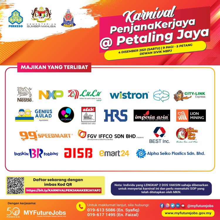 Anda sedang mencari kerja? PERKESO Negeri Selangor bersama Majlis Bandaraya Petaling Jaya (MBPJ) mempelawa orang ramai untuk sertai Karnival Kerjaya Petaling Jaya 2021 yang akan dilaksanakan secara fizikal pada tarikh dan masa yang ditetapkan. Terdapat lebih 1,000 jawatan kosong untuk diisi dengan penglibatan 20 majikan dari pelbagai sektor.