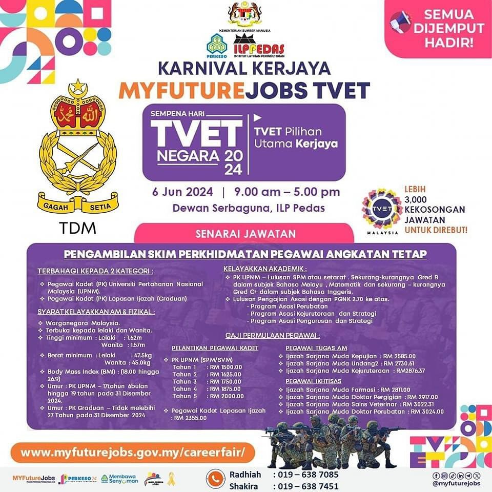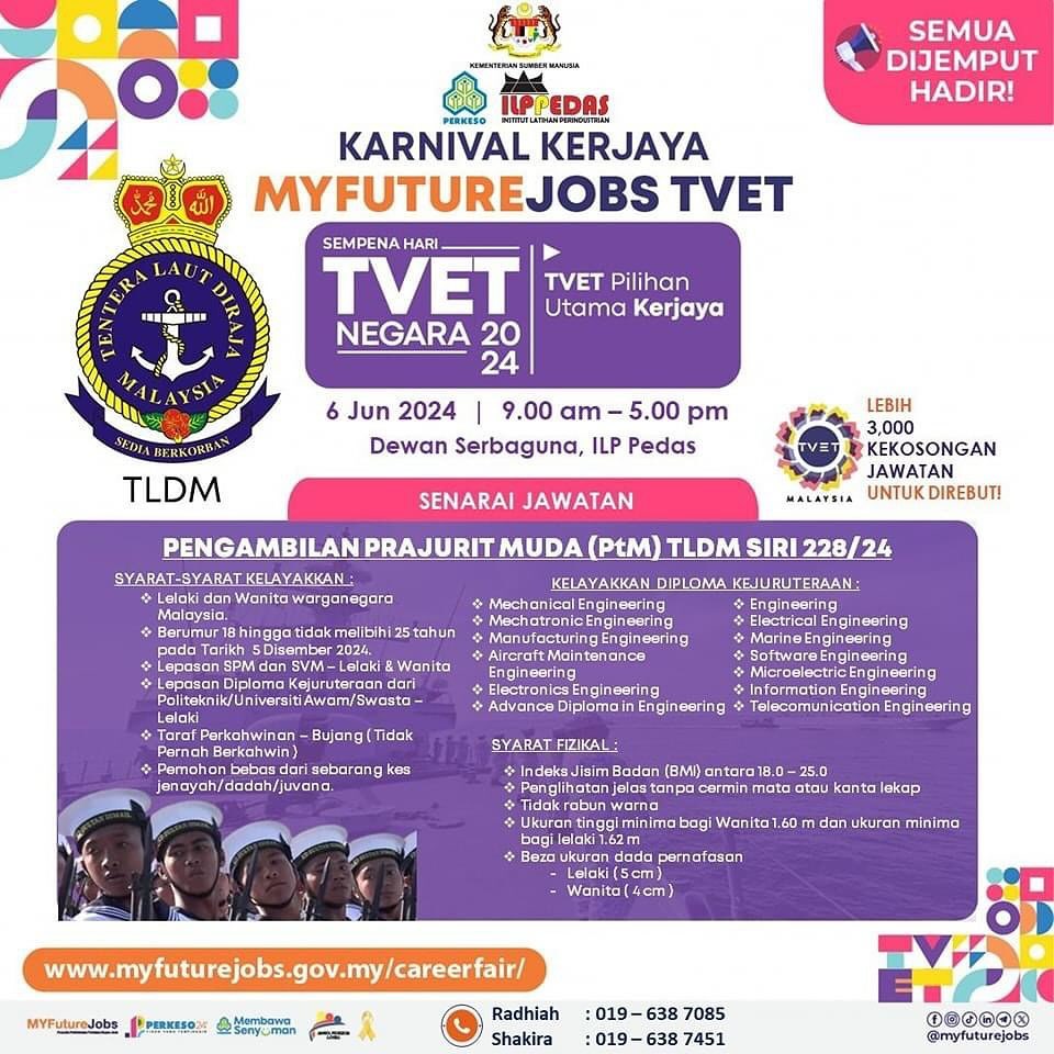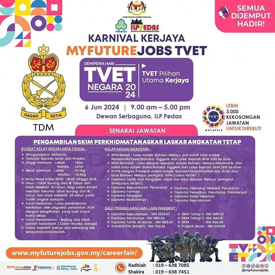 Bersempena dengan Karnival Kerjaya MYFutureJobs TVET, Tentera Darat Malaysia (TDM) dan Tentera Laut Diraja Malaysia (TLDM) akan mengadakan pengambilan di Dewan Serbaguna, ILP Pedas! Anda dijemput hadir beramai-ramai bagi memeriahkan acara tersebut!