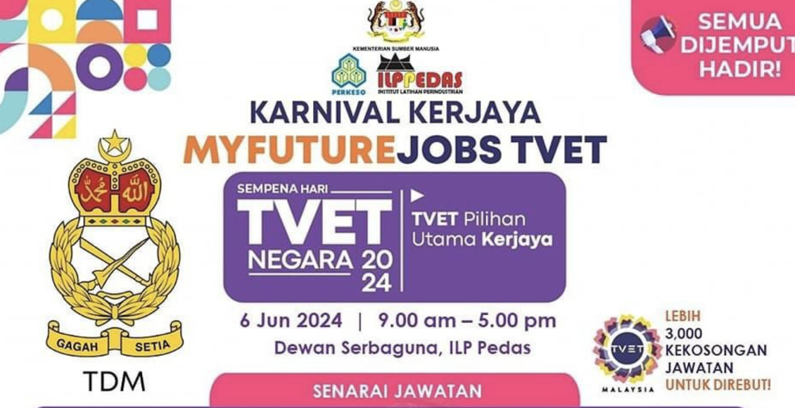 Jangan lepaskan peluang ini untuk mengisi lebih 3000 kekosongan jawatan yang ditawarkan! Datanglah beramai-ramai ke Karnival Kerjaya MYFutureJobs TVET di Dewan Serbaguna, ILP Pedas pada 6 Jun 2024!