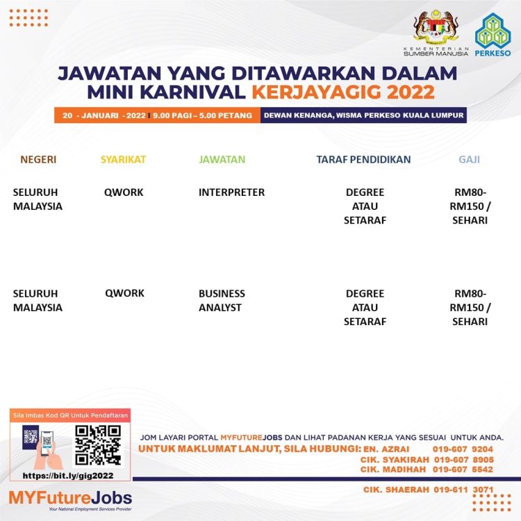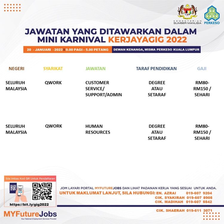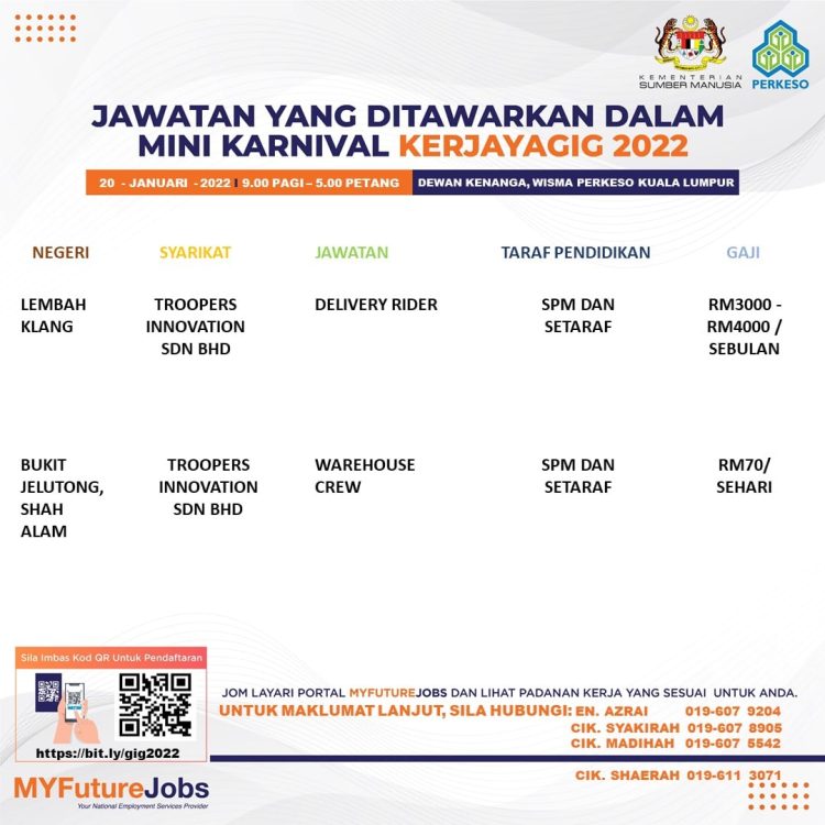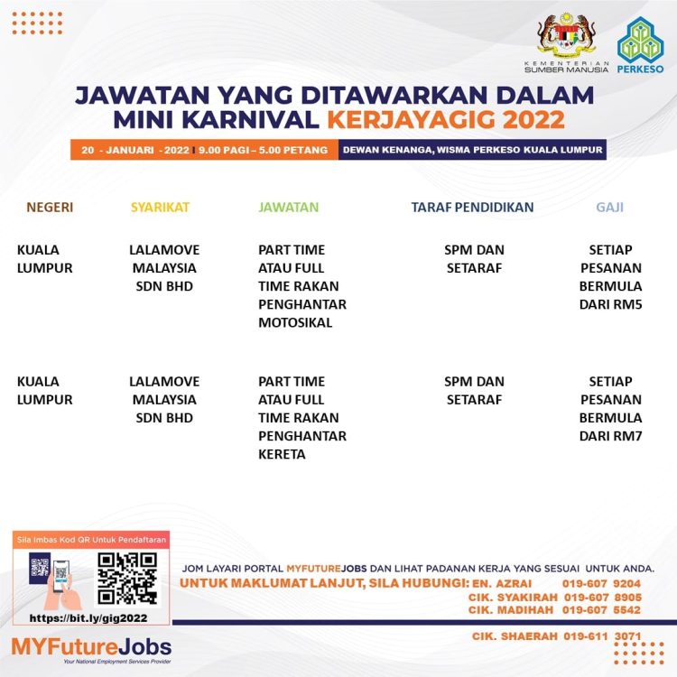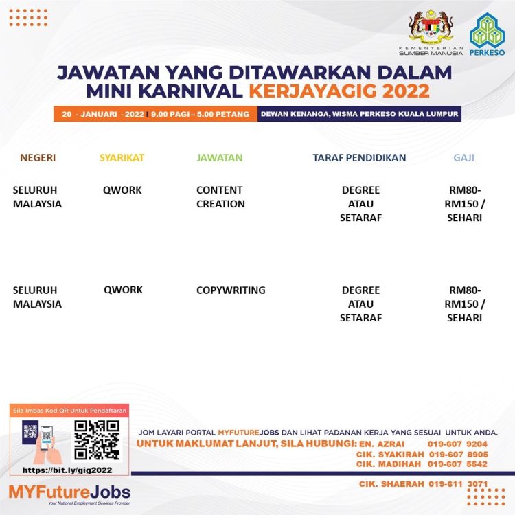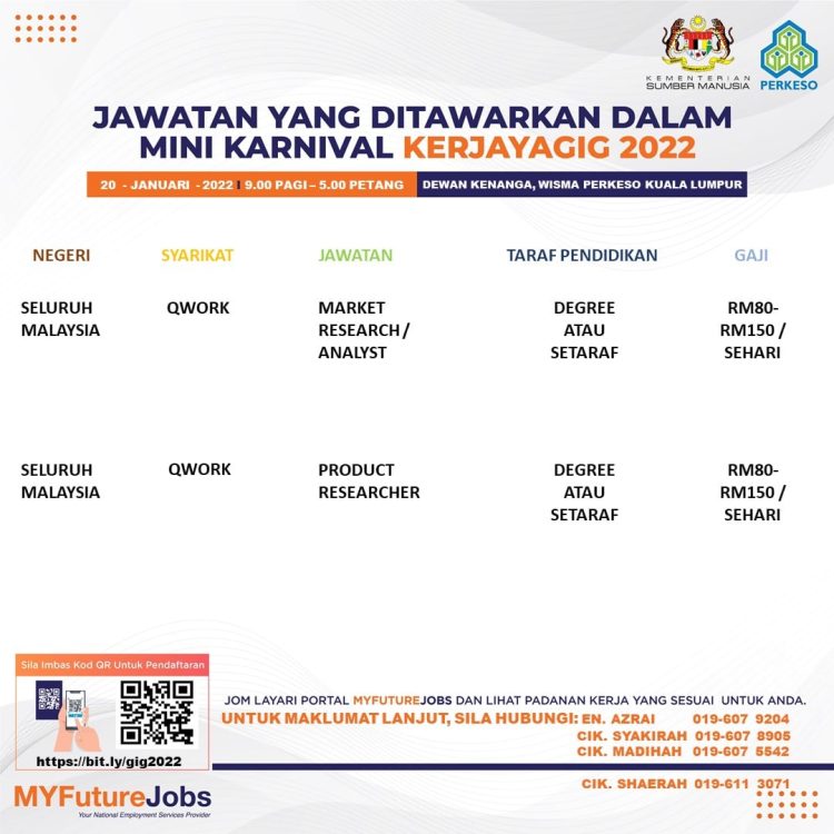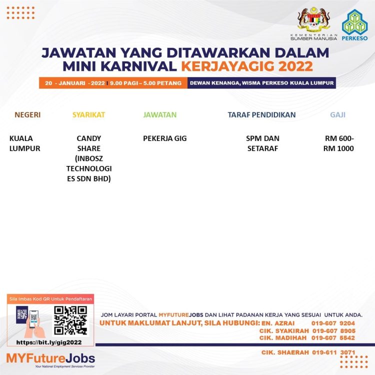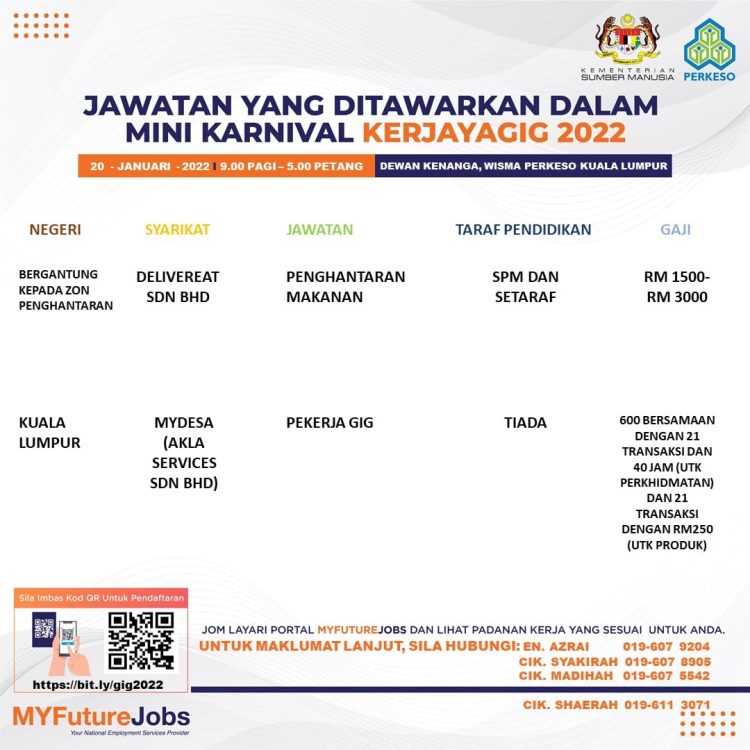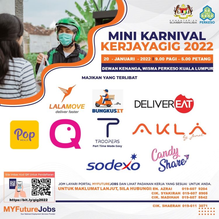 Sekiranya anda berminat untuk sertai karnival yang akan berlangsung pada 20 Januari 2022 dan memerlukan pekerjaan yang ditawarkan, anda boleh buat pendaftaran bagi menyertai Mini Karnival KerjayaGig 2022.