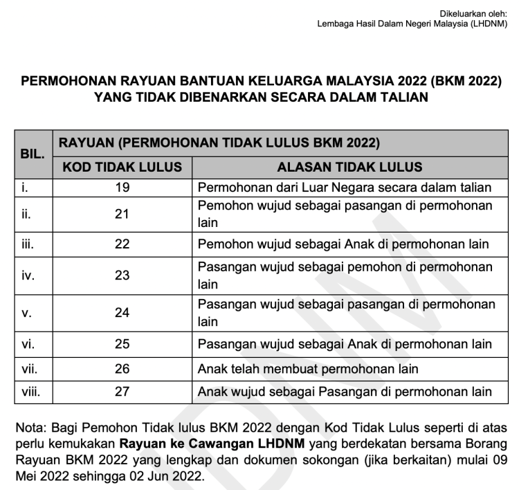 Bagi permohonan yang TIDAK LULUS BKM 2022 dengan Kod Tidak Lulus seperti dinyatakan di atas perlu kemukakan Rayuan ke Cawangan LHDNM yang berdekatan bersama Borang Rayuan BKM 2022 yang lengkap dan dokumen sokongan (jika berkaitan) dalam tempoh ditetapkan.