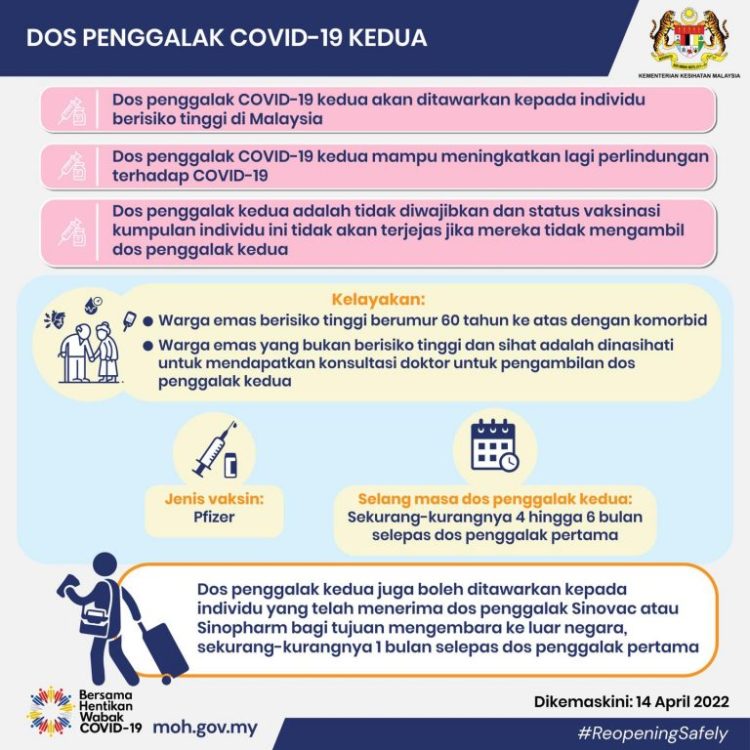 - Dos penggalak Covid-19 kedua akan ditawarkan kepada individu berisiko tinggi di Malaysia