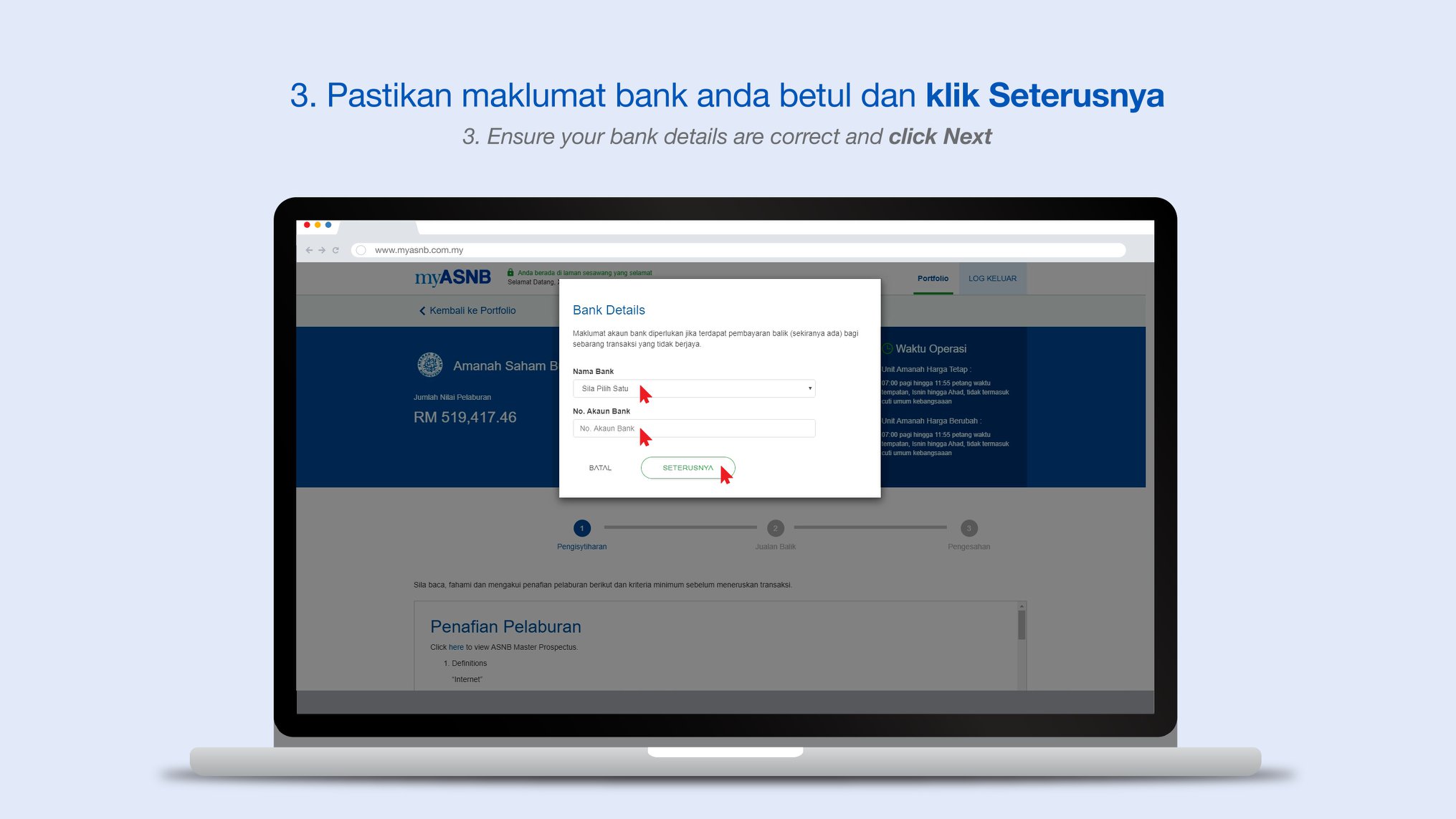 Langkah 3: Pastikan Maklumat Bank Anda Betul. Klik Seterusnya