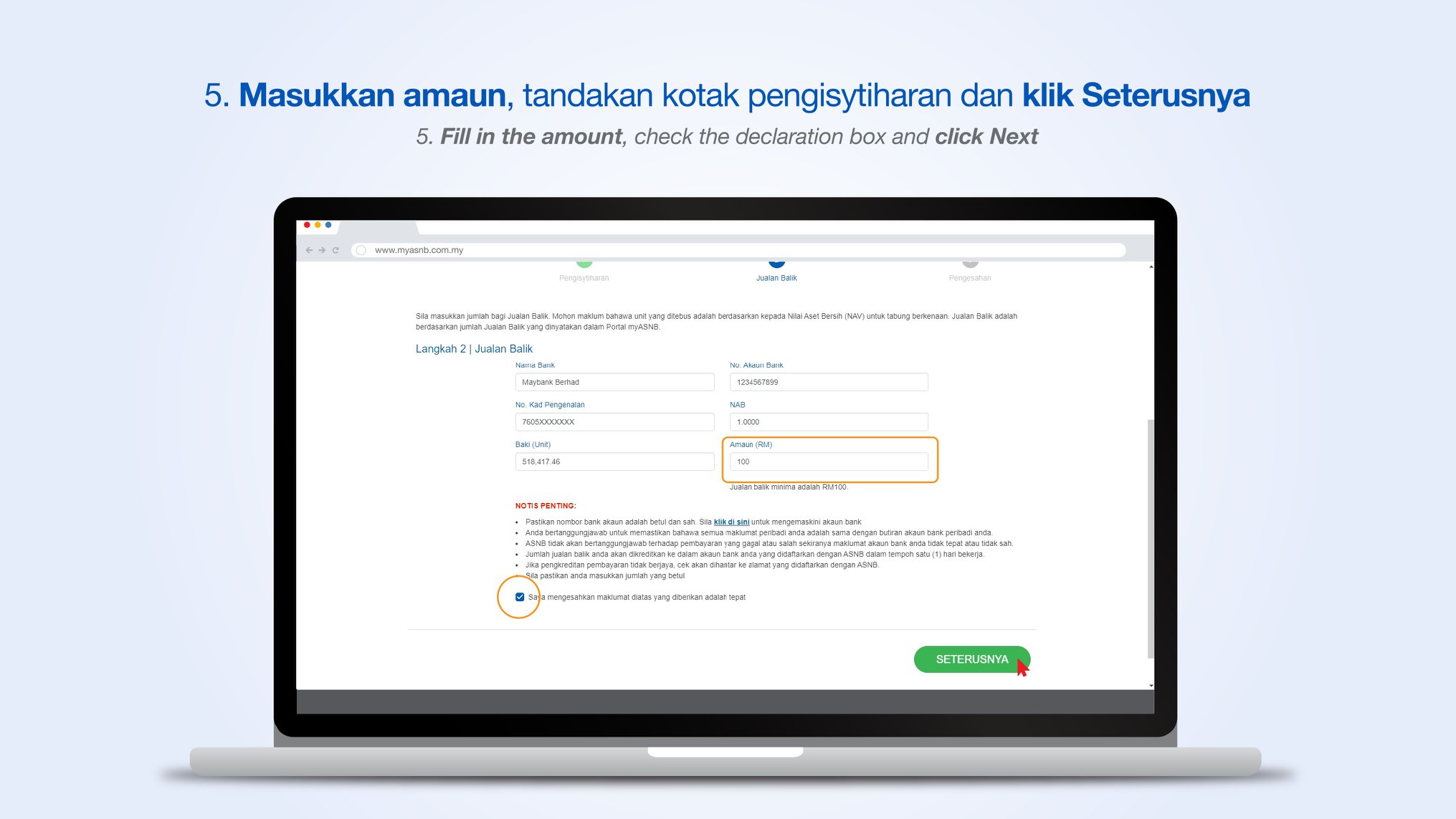 Langkah 5: Masukkan Amaun, Tanda Kotak Pengisytiharan dan Klik Seterusnya